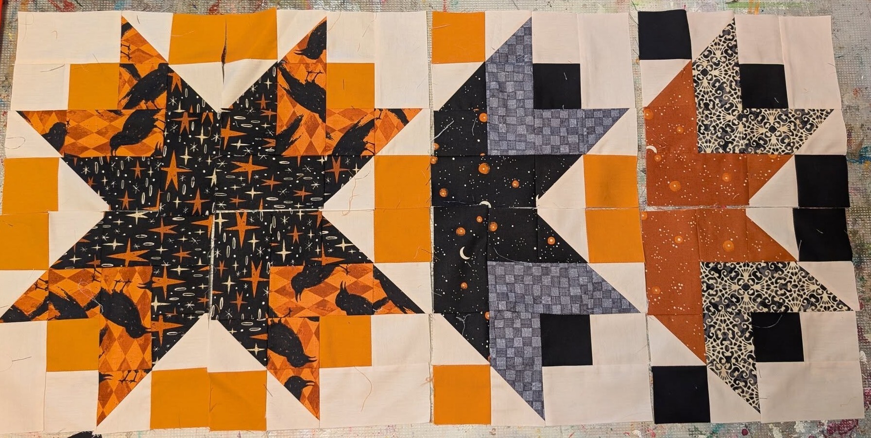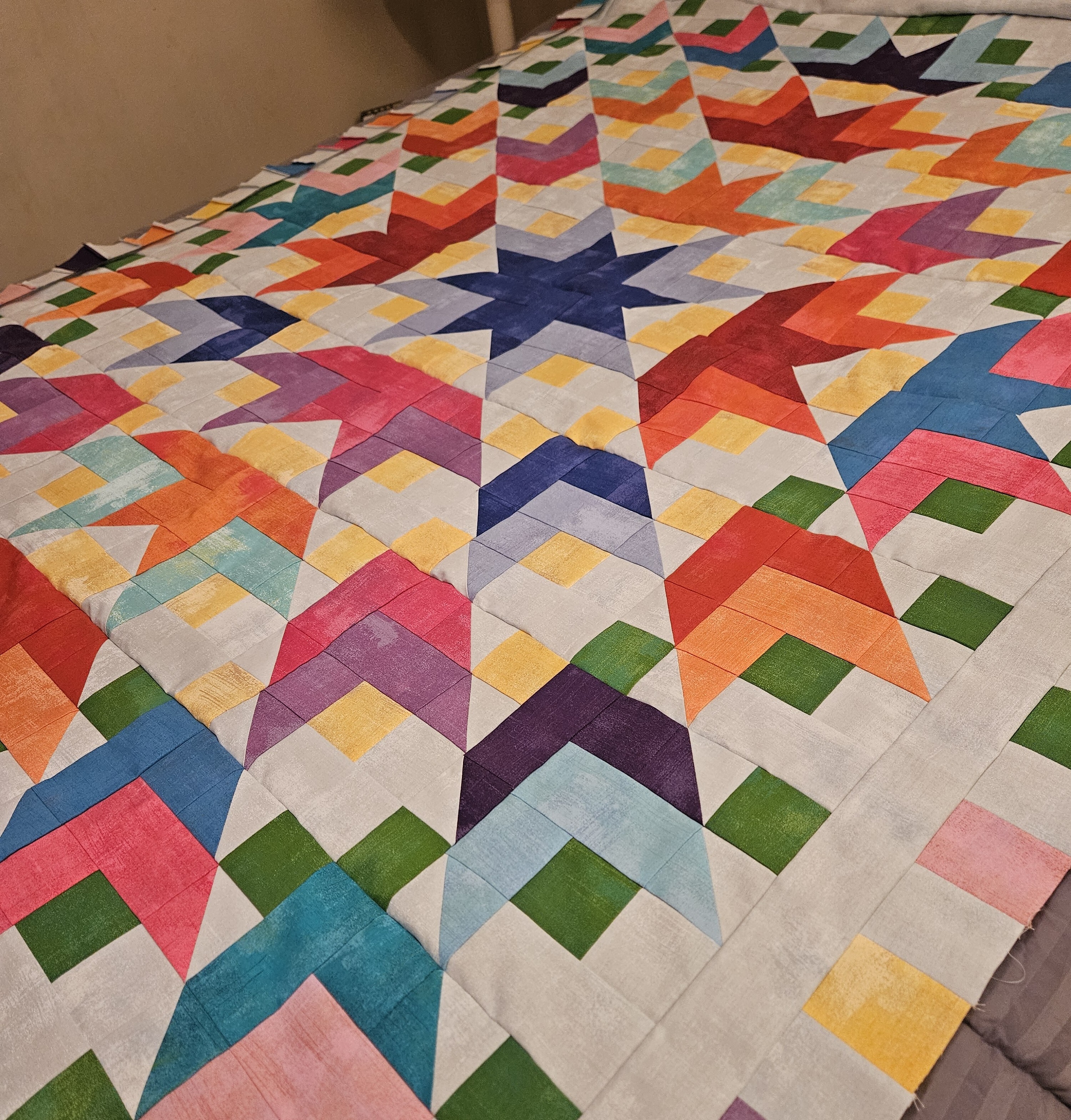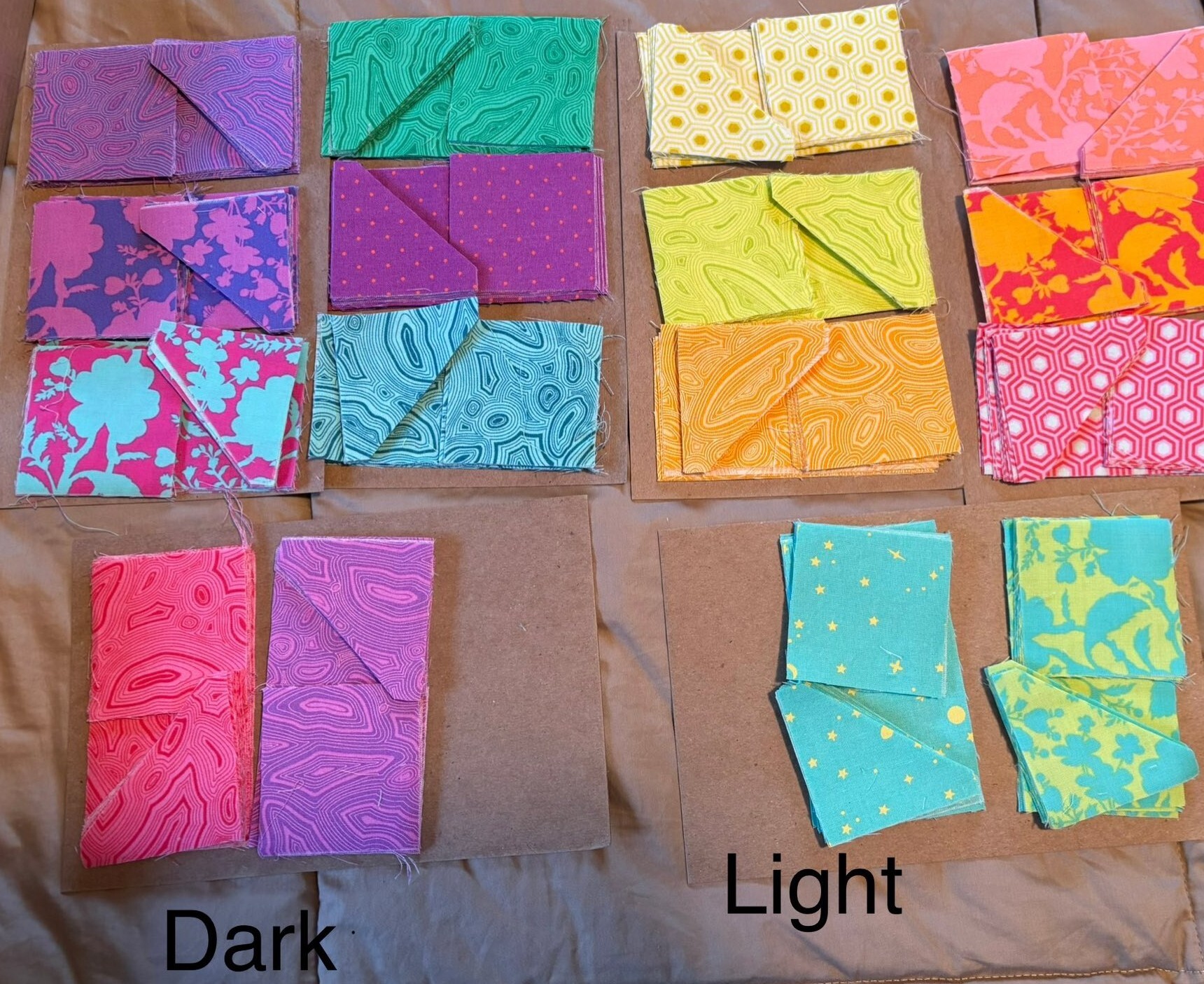 We began by sewing 48 blocks using our background fabric paired with two contrasting colors, all neatly organized in our pre-cut kits. Next, we divided the color palette into what we considered lights and darks. From there, we carefully stitched squares and rectangles to background triangles, creating two distinct sets of blocks—each ready to be laid out and assembled. With two layout options available, the choice was yours—but we always encourage you to design with your heart. And the results? Absolutely stunning!