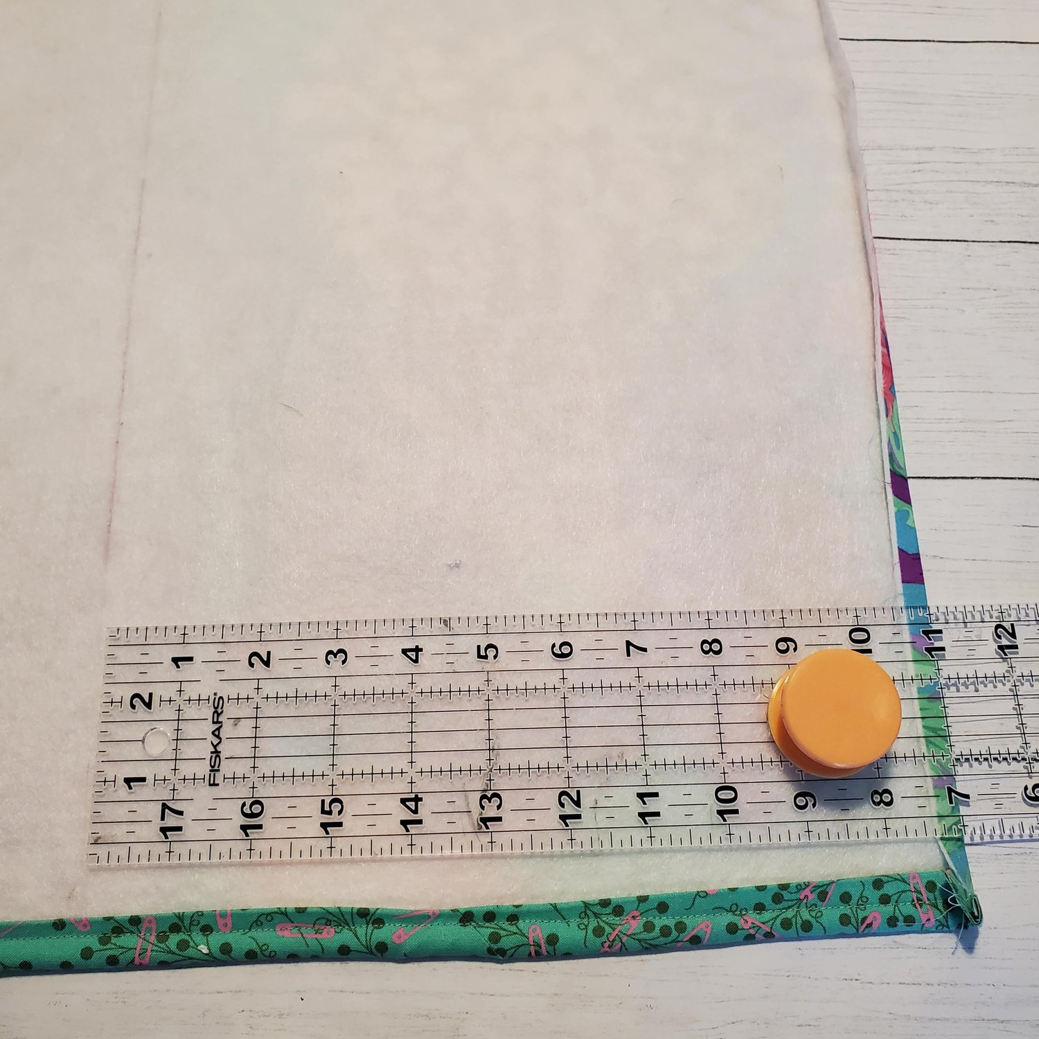 To create a fabric sleeve for the tube to fit into you will need to measure the circumference of the tube. My tube was 3” in diameter and when I placed a tape measure around the tube it measured 10 inches. I added 1.5” to that number to allow space to turn the raw edge under about ⅜” and space to topstitch in place. Draw a line on the fusible fleece side at 11.5” from the unfinished edge.